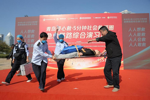 10月29日,“青岛爱心救·五分钟社会救援圈”急救链路综合演习活动在青岛音乐广场举办。