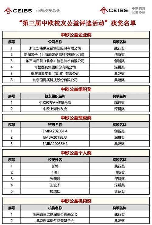 其中,6家中欧校友企业获得 “中欧公益企业奖”,2个校友组织获得 “中欧公益组织奖”,3个班级获得 “中欧公益班级奖”,5位校友获得 “中欧公益个人奖” ,2家机构获得 “中欧公益机构奖”,具体获奖名单如下: