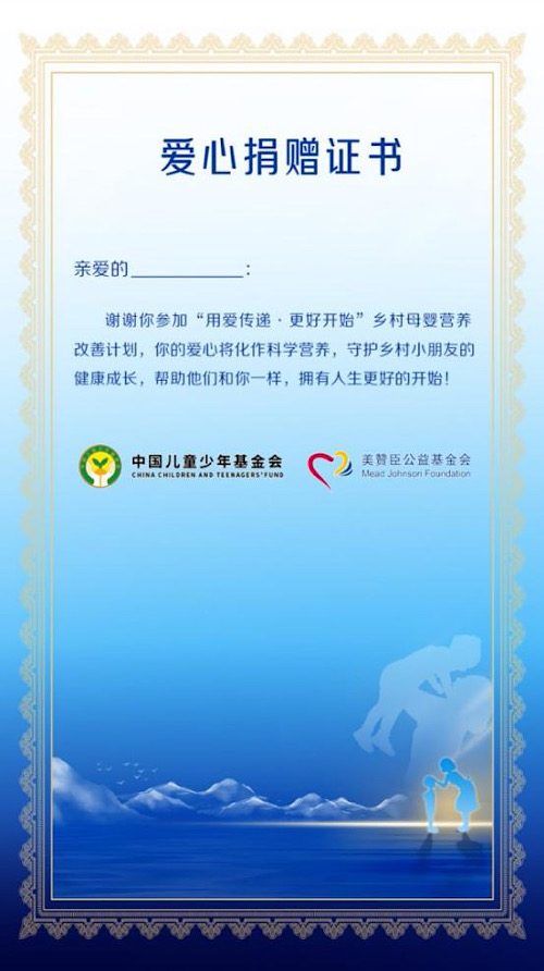 据悉,全新升级的第四期“用爱传递·更好开始”公益计划将从5月28日开始,消费者只要在美赞臣指定官方渠道购买5罐美赞臣奶粉,参与美赞荟官方小程序活动,消费者将为宝宝获得由中国儿童少年基金会及美赞臣公益基金会颁发的“爱心捐赠证书”,同时美赞臣中国将会携手中国儿基会向乡村孩子捐赠一罐美赞臣奶粉,这份证书将成为妈妈们送给宝宝值得珍藏的六一礼物。