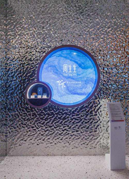 「鱼纹」是周生生的标志性图腾,大自然赋予鱼盎然的生机及其身上独特而闪光的纹理,周⽣⽣将这种美丽与生机融⼊品牌,代表⽣命的循环和⾃然的美好,也将它延展为行走中的踪迹。以鱼纹为灵感的中国水墨画画作《涟漪》是此展区的展品之一,画作色彩丰富,直观表达鱼纹之曼妙;从陈坤的摄影作品中也可寻见鱼纹的引申,在人与山林互相感受、心灵交融的瞬间,鱼纹随着愉悦化作人们笑开时眼尾的纹路;谢欣的行走纪录片同样展陈于此,她擅用肢体感触天地,更在行走中有感而舞,于大自然中刻画鱼纹的生命力,这是水流中本源的鱼,一跃而起、能量无尽。
