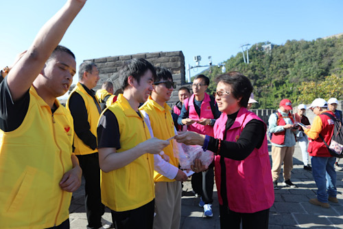 15日清晨,志愿者们在10号线健德门地铁C口外西侧迎接参与者,共同搭乘大巴前往慕田峪长城。在车上,志愿者与视障人士相互介绍,工作人员细心登记、清点人数并分发午餐包,抵达慕田峪长城后,参与者们在南登山口进行了热身和登山仪式,随后在志愿者的引导下,视障人士一步步攀登长城,聆听志愿者讲述长城的历史和周围的美景。志愿者引导视障人士用手触摸长城的砖石,感受千年历史的沧桑与厚重。在志愿者的讲解下,视障朋友们与古老的城墙进行了一次心灵的对话。