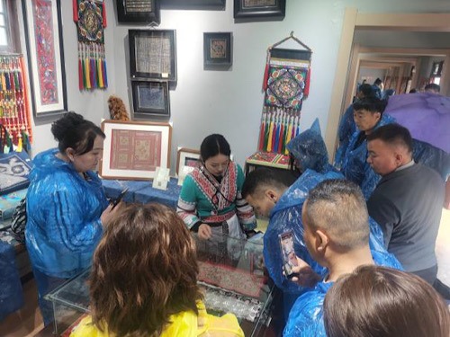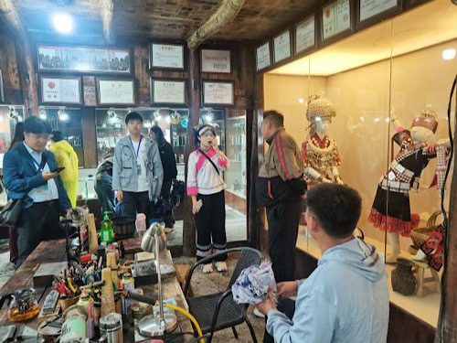 在乌江源化屋村的苗绣厂区,苗族刺绣展示间、蜡染产品展示间、非遗文化产品展示间、化屋村文创产品直播间依次排列。学员们在这里亲身感受传统古寨非遗资源活化、绿色生态与智慧乡村带动乡村建设的成功实践,为日后在自己家乡的工作积累宝贵的借鉴素材。