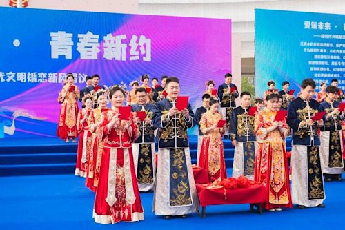 “520”集体婚礼是对文明婚恋新风尚的倡导,也是服务青年婚恋的创新实践。参加集体婚礼的百余名新人来自科研、教育、医疗、乡村等不同领域,既有科技工作者、军人警察,也有青年工匠、“新农人”和快递小哥。