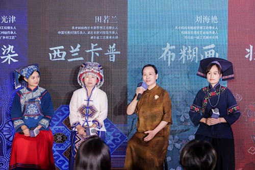 启动仪式现场,来自广西的壮绣、贵州的枫香染、河北的布糊画、湖北的西兰卡普精美非遗作品吸引了众多人的目光。这些作品表达了美好的寓意和祝福,体现了当地人民对生活的热爱和对未来的期盼,展示了非遗手工艺的鲜活生命力。