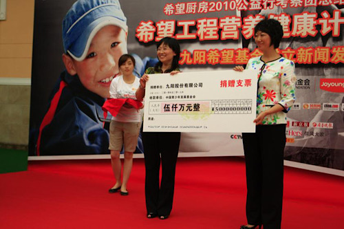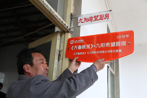 为了解决欠发达地区学生面临的“进得起学堂,进不起食堂”的问题,2010年,九阳在中国青基会设立“九阳希望基金”,10年内为欠发达地区学校建设1000所“九阳希望厨房”,改善乡村孩子的营养条件。