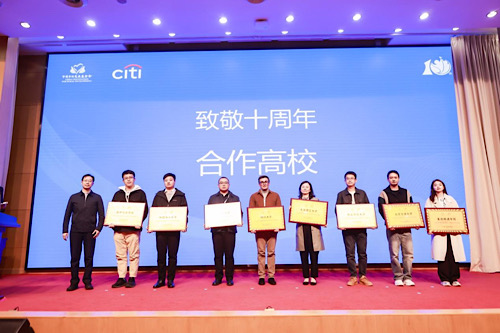 10年成果来之不易,在总结会现场,中国乡村发展基金会向十周年伙伴花旗中国、十周年合作高校、老师代表与往届参与同学致敬。