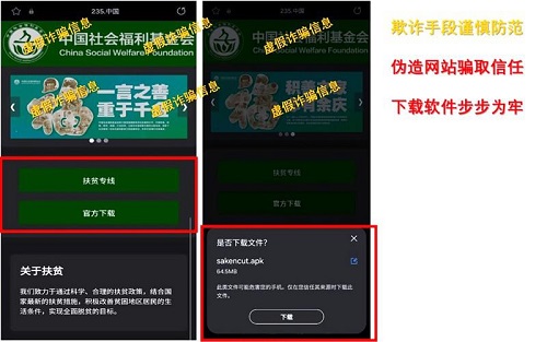 而在数日前,中国社会福利基金会也在官方微信公众号发布文章,表明有不法分子冒用其网站样式、网站内容,通过虚构国家政策文件、制作假冒网站、制作假冒手机APP应用、假冒基金会领导人名义进行网络宣讲、假冒客服进行欺骗诱导等方式,以“激励”“返现”“实时到账”等诱惑,在网络上拉拢不明真相的群众申购所谓的“扶贫项目”,以公益之名进行网络欺诈活动。对此,中国社会福利基金会表示已收集相关证据材料提交公安机关进行立案侦查,并号召广大网友谨慎防范各种形式的网络诈骗活动。
