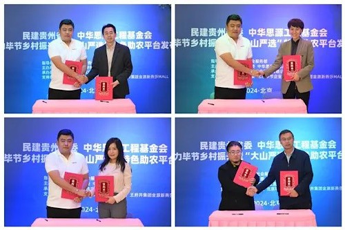 发布会上,“大山严选”平台负责人分别与中华思源工程基金会、拼多多、一亩田、叮咚买菜、锅圈食汇签署了合作协议,民建贵州省委、毕节市商务局与北京本来工坊科技有限公司签订了三方合作协议。