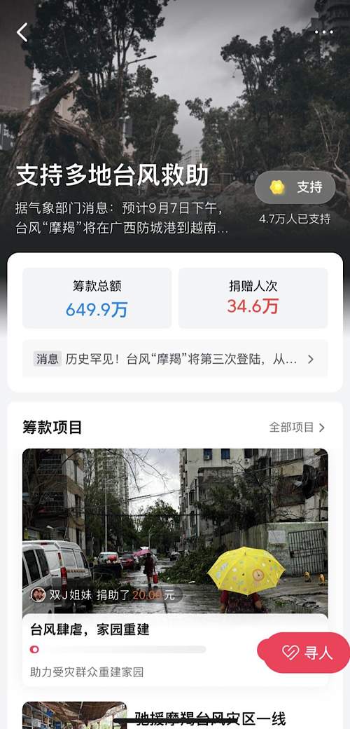 9月11日,北京字节跳动公益基金会宣布捐赠500万元,联合中国教育发展基金会、中国乡村发展公益基金会等公益机构,支持海南、广东等受灾严重的地区开展道路清障、校园修缮等灾后恢复重建工作。